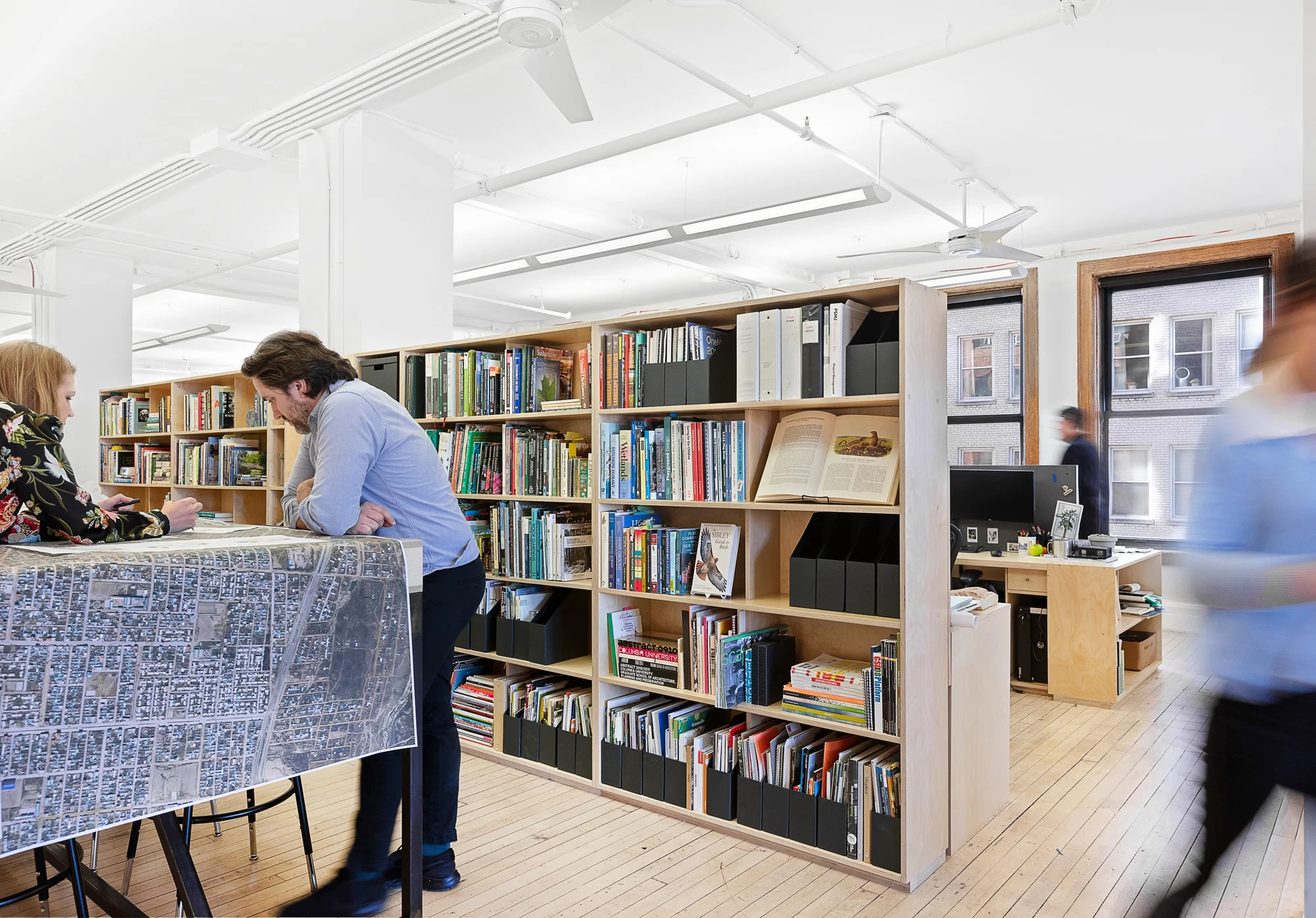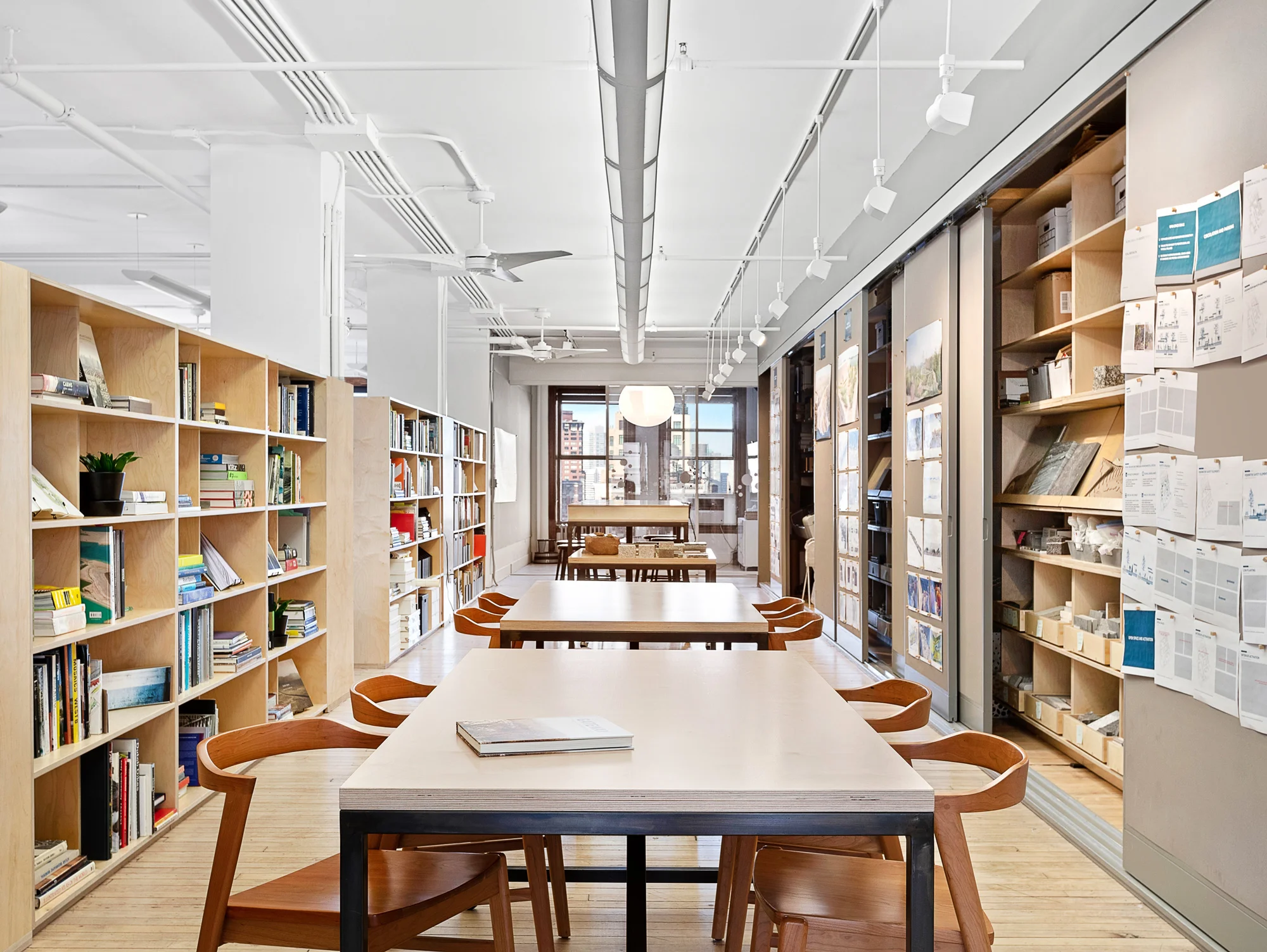 We provided custom desk, worktable, pin-up, and storage pieces that allowed them to have clustered office seating along the window wall with flexible work tables in the middle of the space for impromptu meetings and production of model and large-scale drawings. In the worktable area we also designed and fabricated pin-up doors that slide along track concealing the material storage. The material library was conceive to have both angled face-out board to exhibit materials and heavy duty drawers that are built to carry stone.